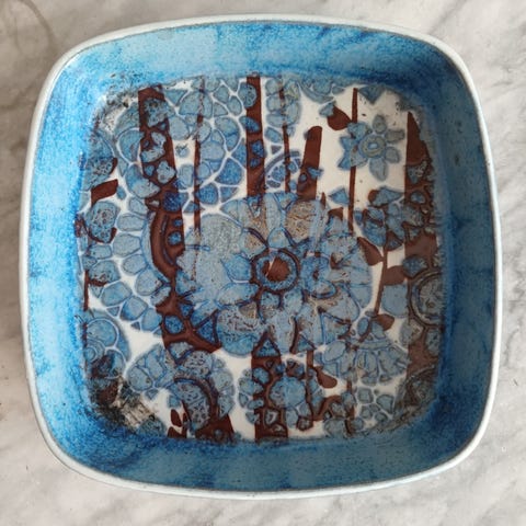 Royal Copenhagen / Aluminia Tenera firkantet fat i fajanse, designet av Inger Lise Kofoed på 1960-tallet. Et flott og tidstypisk eksempel på dansk mid century modern design.