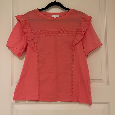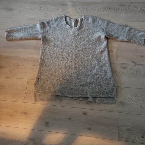 Lys lilla strikkegenser med vide ermer og splitt i siden. Har desverre et lite hull øverst på skulderen.