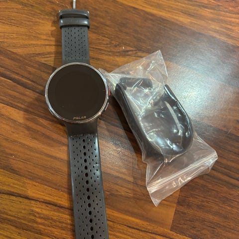 Fungerer uten problemer. Nylon reim, ladekabel og original reim medfølger.