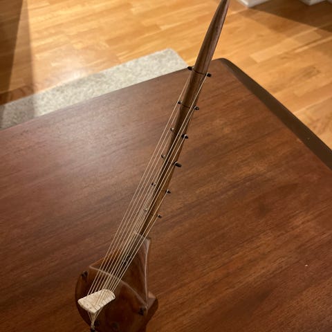 Rosen autoharpe med 6 coards og 25 strenger med stemmenøkkel som er inntakt. Rosemotivet er også intakt .Den har et akordsystem i midten med markeringen intakt.Et unikt produkt til en musikkelsker. Den har tre små føtter på baksiden. Det har vert en dprekk bsk som er limt og ordnet for ca 10 år siden. Disse har ikke etter har ikke utviklet seg siden .