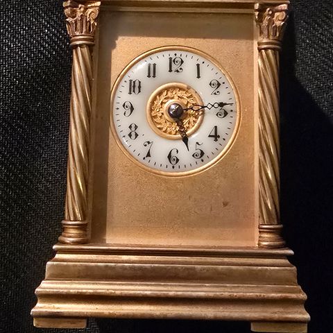 Klokken har hvit urskive med svarte romertall og svarte visere.