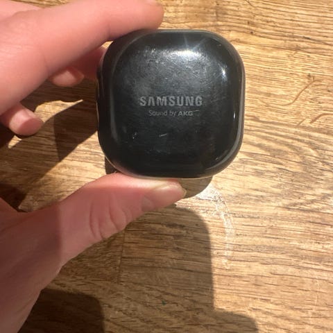 Samsung Galaxy Buds SM-R177 trådløse hodetelefoner i svart med hvitt ladeetui. Hodetelefonene har en kompakt design og leveres med et ladeetui som støtter USB-C-tilkobling for lading.