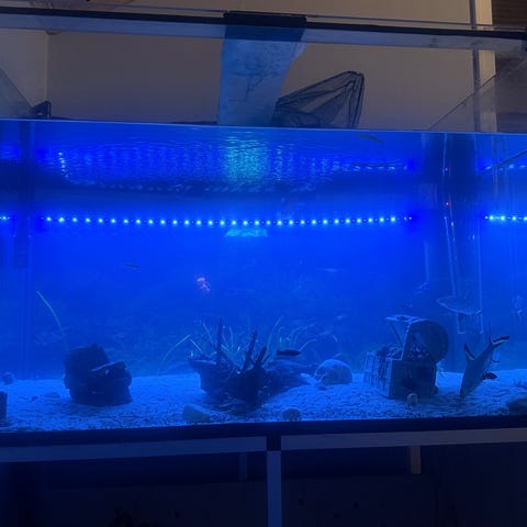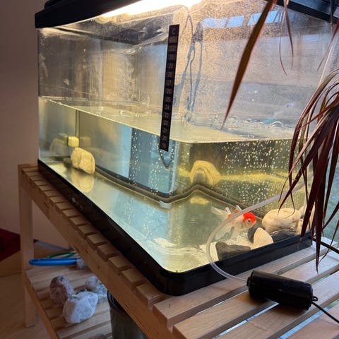 Har litt riper på glasset pga grus, har ingenting å si for kvalitet. Kan evt fikses med glasslim som jeg kan tilby om det er ønskelig. Fisk må følge med. Selges pga jeg ikke har tid til å vedlikeholde mer. Ps. Litt grums i bildet pga nylig vannbytte. Om det skal være noe spm bare spør i vei! 70liter.