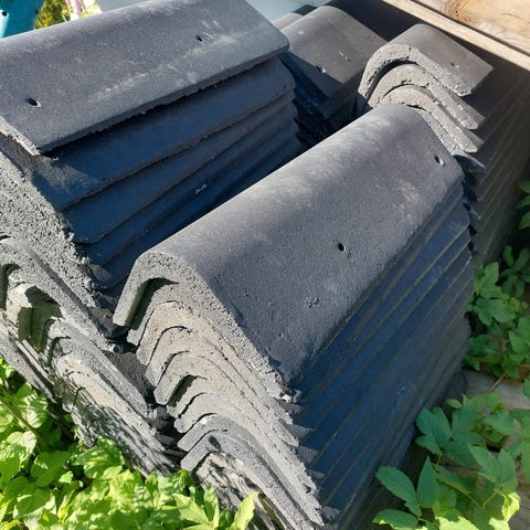 Samling av takstein i forskjellige farger som rød, svart og grå. Taksteinene er stablet i bunker og pakket for oppbevaring. Passer til bruk ved taklegging og reparasjon av tak. Materiale og eksakte størrelser ikke spesifisert.