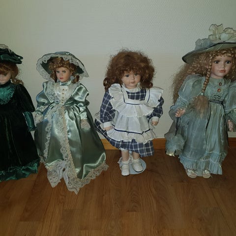 Porselensdukke kledd i flerfarget genser, beige bukser med grønne og røde detaljer, og røde sko. Dukken har blå øyne og bærer en liten bamse som tilbehør. Passer som samleobjekt eller dekorasjon.