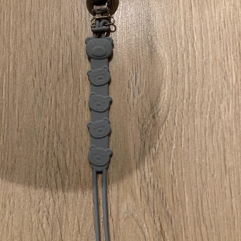 Heklet lenke/snor til smokken. Lengden er 22cm fra ytterst på smokkefestet og til festeklemmen begynner slik som regelverk sier.