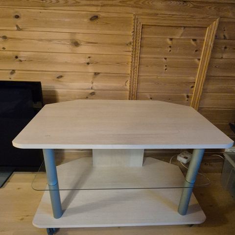 TV-benk i hvit høyglans med skuff og åpne hyller. Møbelet har kabelhull for enkel ledningshåndtering. Passer til oppbevaring og plassering av TV og tilbehør. Noen små bruksmerker på overflate, men i god stand.