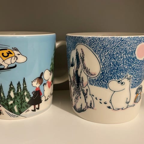 Mummikopp fra Arabia «Fjomsedyret» (2010-2019) med etikett selges. Kopper produsert med Kronestempel ble produsert i årene 2010-2014.