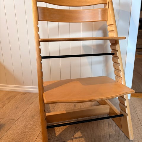 Stokke Høy barnestol laget i tre. Stolen har justerbar sitte- og fotplate for tilpasning etter barnets størrelse. Egnet for barn og designet for å gi støtte ved måltider og aktiviteter ved bordet.