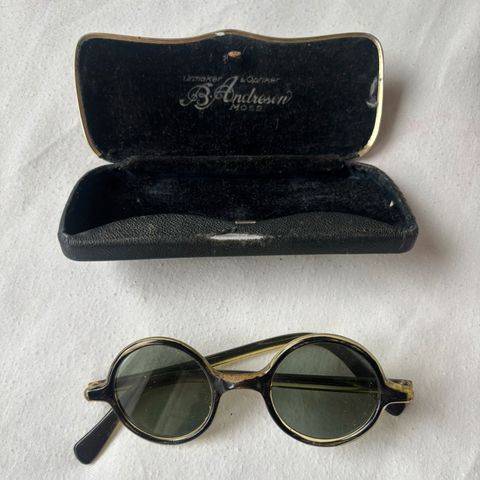 Gamle briller i Etui med uleselig stempel