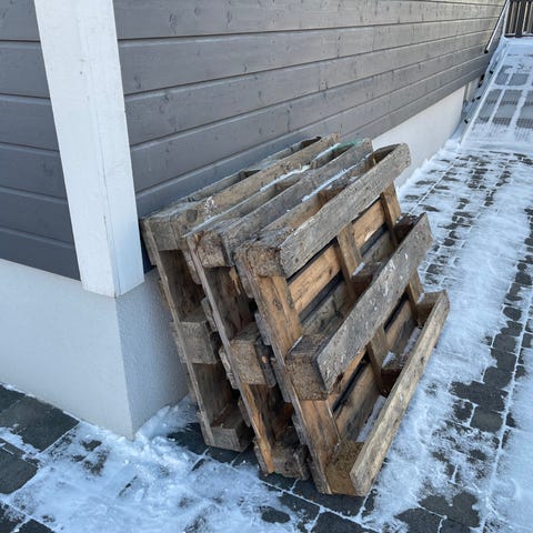 Tre europall laget av tre. Standard størrelse for transport og lagring av varer. Må hentes