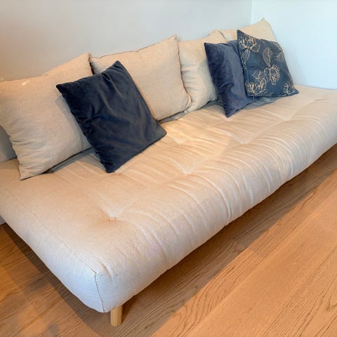 Stilren sovesofa fra danske Karup Design, med futon madrass i fargen Linen. Dras ut til daybed/sovesofa. I svært god stand, men selges grunnet plassmangel. Nypris var 13.849, og den ligger ikke ute til salg. Så dette er en god mulighet til å gjøre et kupp.