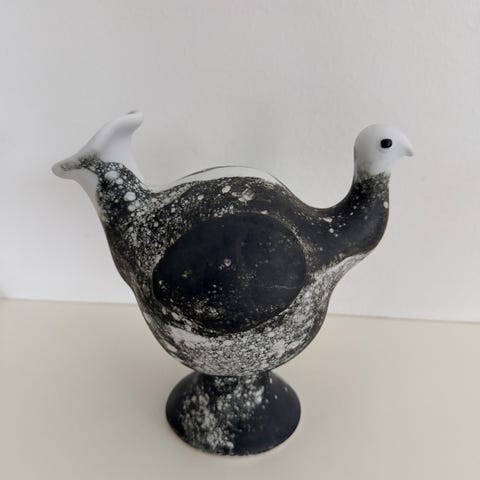 Vinhøne i formstøpt porselen design av den anerkjente norske keramiker Leif Helge Enger (1934) for Porsgrund Porselen håndverks - studio. I produksjon 1980 - 1985. Delvis uglasert og blank blå glasur. Håndmalt med sorte detaljer. Mål: Høyde 19,5 cm. Lengde 19,5 cm. Vekt 672 gr. Merket: PP logo. Porsgrund håndverks - studio. Leif Helge Enger. Norway. I meget god stand. Modellen finnes i forskjellig farger og dekor. Attraktivt samlerobjekt.