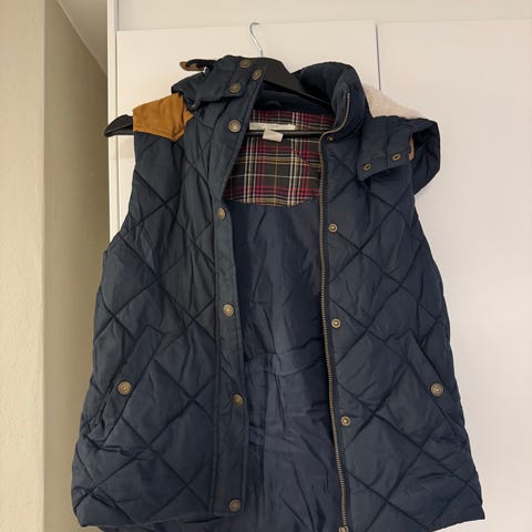 Lang blå vest selges. Tykk og varm, lite brukt. Str S.