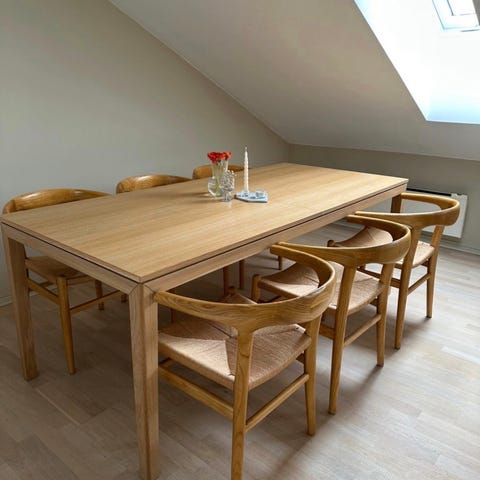 Vi selger vårt fine salongbord i heltre eik fra den danske møbelprodusenten Vannerup. Bordet har skrå kant på bordplaten og firkantbein. Bordet er meget pent selv om det har fått et lite hakk mot en av hjørnene (kan eventuelt fylles med eikefiller). Selges mot henting.