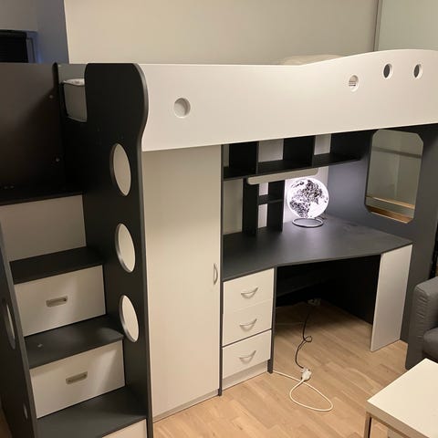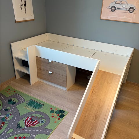 FLEXA WHITE halvhøy seng 90x200 med stige og sklie. Kan benyttes også som vanlig seng uten sklie, sengehest, trapp, og forhøyede ben.