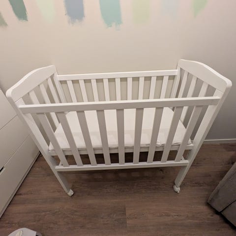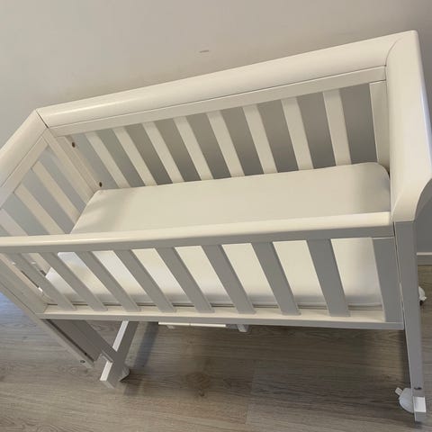 Vi har tatt av den siden som kan tas ned for enklere flytting av baby frem og tilbake. Noen skraper, men veldig lite brukt da baby kun ville samsove. Har enda delen, men mangler 2 skruer for å sette den på plass.