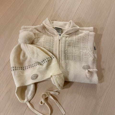 Lillelam ulldress i fargen lyng. Størrelse 86, i god stand/fint brukt. Lua er ny med lappen på, størrelse 50/52.