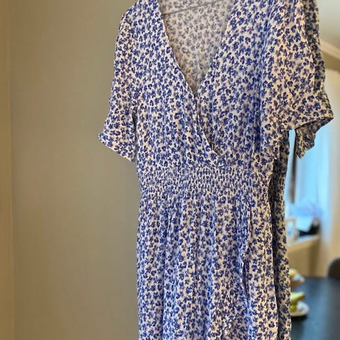 Veldig søt kjole fra Va Vite selges veldig billig. Den er uten underkjole, og den er blitt solbleket spesielt på den ene skulderen og ermet. Jeg har derfor brukt den som strandkjole over badetøy. Leveres skånsomt vasket og klar til bruk.