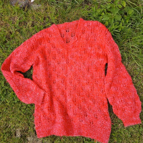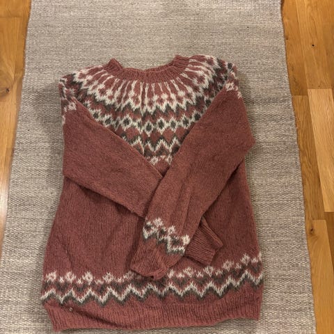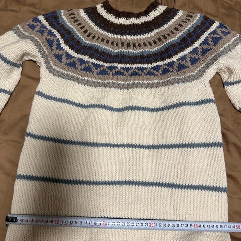 Hjemmestrikket ull T-skjorte i str L, selv kjøpt på finn men ble litt feil på meg. Skal være ca str L (se mål på bildene). Vet ikke garntype, men skal være ull.