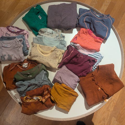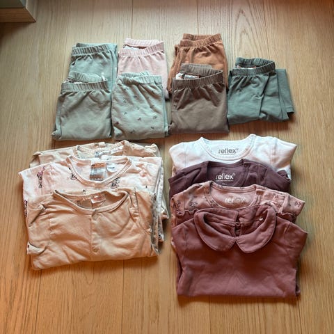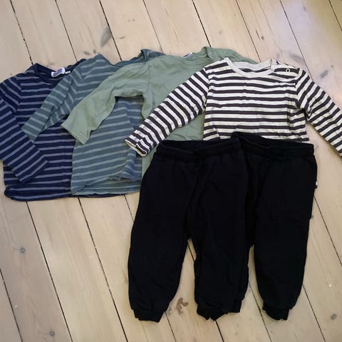 Klespakke i 86, en oversize cardigan i 80 fra Lindex. Snekkerbukse fra Newbie, to langerma t-shirts fra H&M og to gjemmesydde langerma t-shirts med skogsdyr.