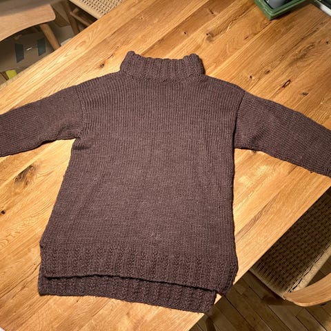 Hjemmestrikket ull T-skjorte i str L, selv kjøpt på finn men ble litt feil på meg. Skal være ca str L (se mål på bildene). Vet ikke garntype, men skal være ull. Fargen er rosa/lilla😅