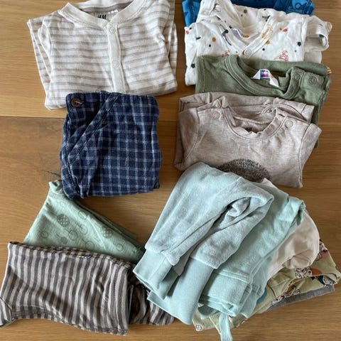 barneklær i størrelse 56, flerfarget og designet for unisex. Jeg har brukt den til gutt🩵 Inneholder ulike plagg egnet for små barn. Merker som Newbie og janus, samt Hm, Lindex osv.