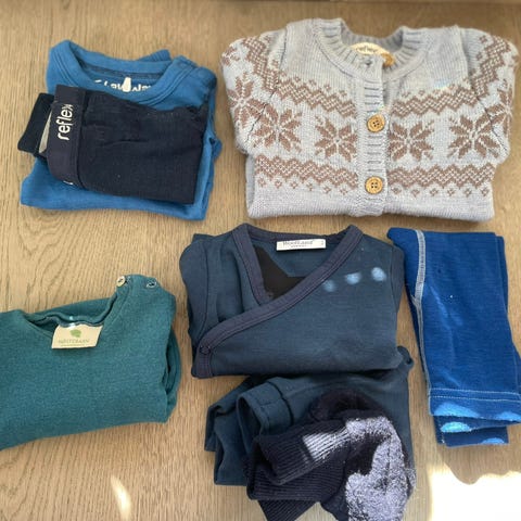 Pent brukt ulltøy i str 50 og 56. Dresser/sett kr 75 bodyer kr 50. Kan selge enkeltplagg eller alt som pakke.
