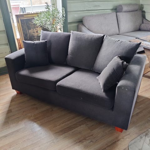Sofagruppe med treseter og lenestol i flott blåfarge selges. Litt flekker på setene i sofaen, og noen hjørner er slitt, selges derfor billig. Må hentes