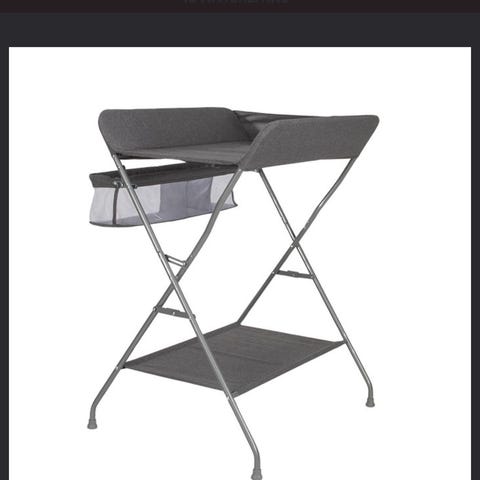 Kaxholmen stellebord i grå farge med sammenleggbart metallramme og stoffoverflate. Utstyrt med oppbevaringsnett og ekstra hylle under stelleflaten. Designet for praktisk bruk ved bading og stell av baby.