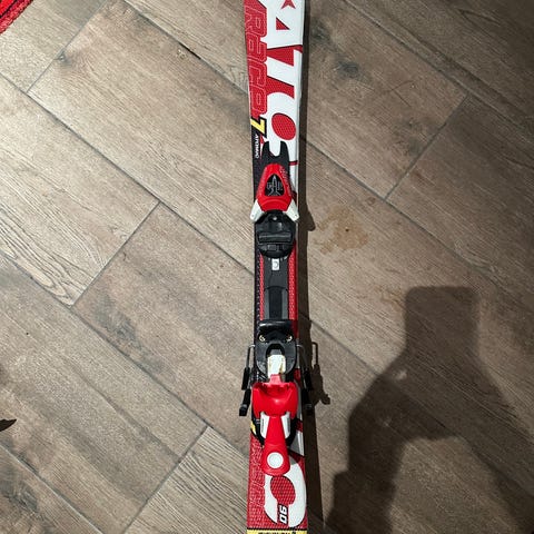 Atomic Race 7 alpinski med en lengde på 110 cm. Skiene er hvite med rød og svart dekor. Leveres med skistøvler i størrelse 22.5/36, hvite med grønne spenner og svart bakre del. Skiene har bindinger montert.