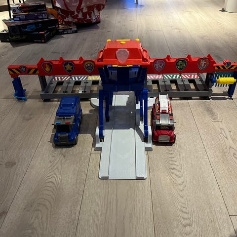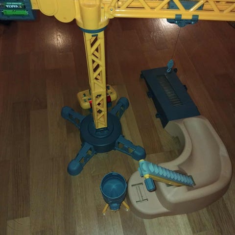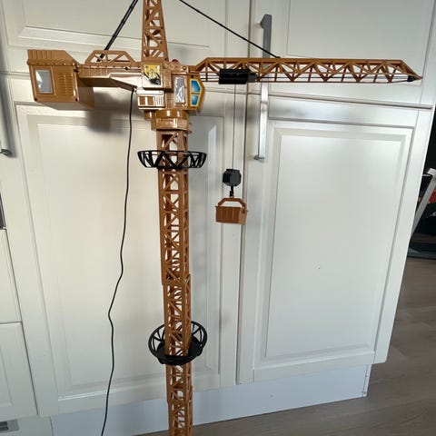 Lekekran selges billig. Krana fungerer, men er godt brukt og tauet som brukes til å heise ting er ganske slitt.