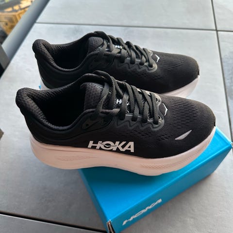 Hoka Sneakers joggesko i størrelse 37. Skoene har en lys farge med detaljer i blått, rosa og grønt. Egnet for løping og daglig bruk.