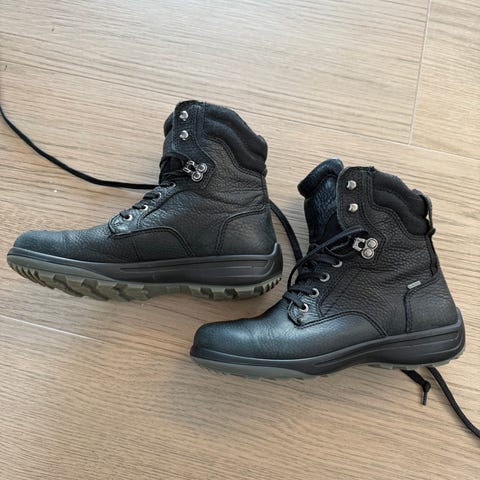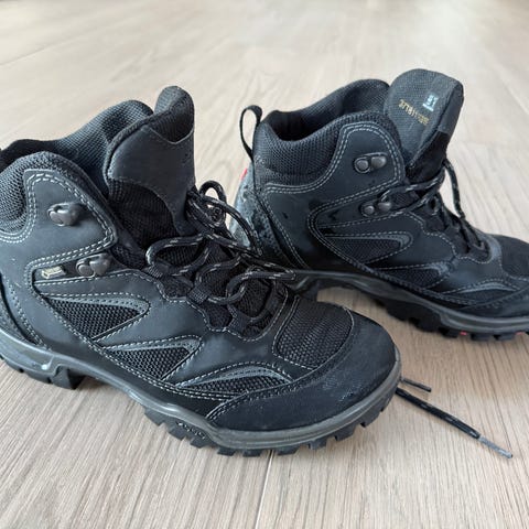 ECCO Vinterstøvler, skinn utenpå og inni. Støvlene har snøring og glidelås, med en solid såle for godt grep. Egnet for bruk i kalde og vinterforhold. Litt små i størrelsen