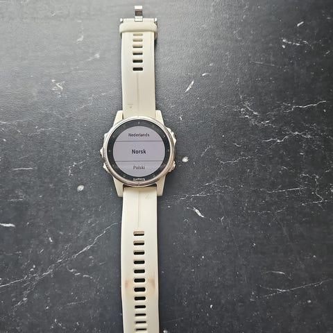 Garmin Fenix 5S Plus smartklokke med hvit rem og gullfarget urskive.