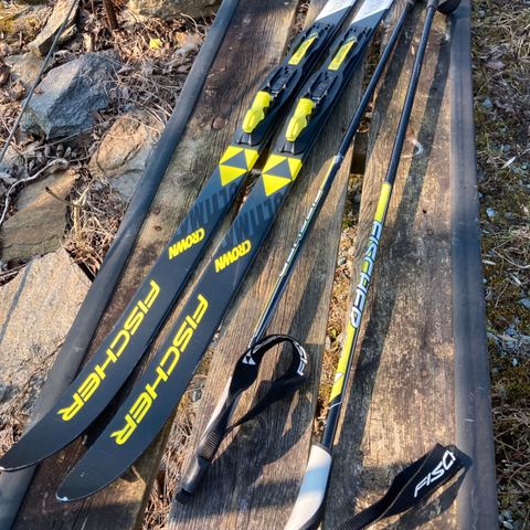 Smørefrie Fischer ski av god kvalitet. Noe bredere enn flere andre modeller. Brukt av 2 barn. Skaller litt av i ene kanten, har ikke hatt betydning for vårt bruk. Rottefella NNN binding.