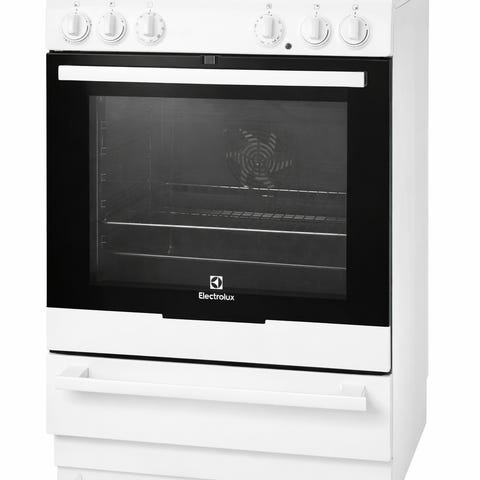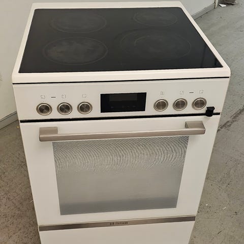 Bosch keramisk komfyr med rustfritt stål og svart front. Komfyren har betjeningsknapper på frontpanelet og en ovnsdør med glass for enkel innsyn.