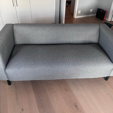 Hel og pen sofa med sjeselong/ chaise lounge. Bredde sjeselong-del 107 cm. Sittehøyde 35.