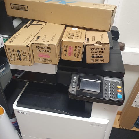 Multiskriver med kopi og scannerfunksjon. Kan settes opp, slik at den scanner til epost og evt. mapper i nettverket. Er du datakyndig, klarer du å sette den opp selv. Har brukt den hjemme i mange år. Selges pga lite bruk. Skriver både A4 og A3 format.
