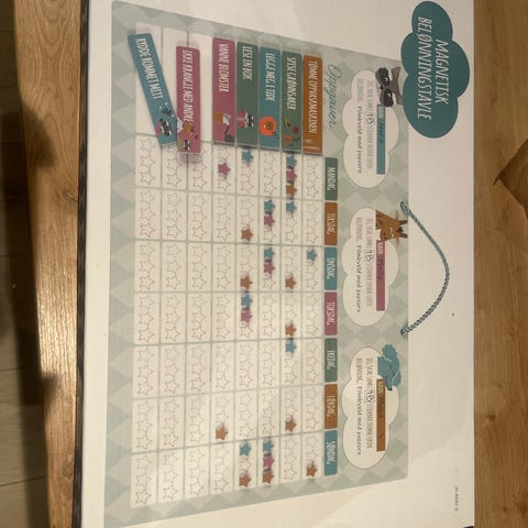 Praktisk og morsom belønningstavle for å lære barna å bli mer deltagende og selvstendige. Med magneter, stjerner og mange forskjellige oppgaver pluss mulighet til å lage egne oppgaver. Tusj følger ikke med.