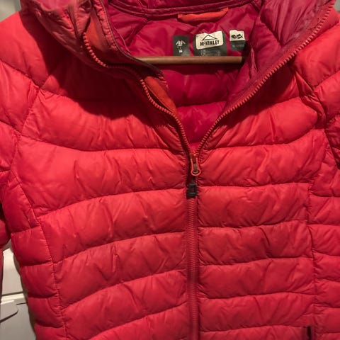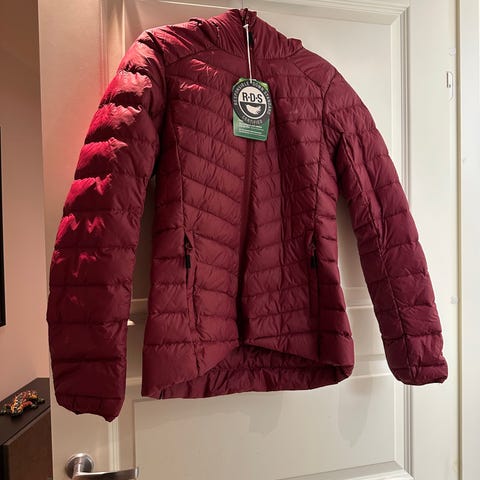 Jakken er nesten ikke brukt, og har ingen synlige bruksmerker. Den er ca 80 cm lang fra krage til nedre kant, så den går nedenfor hoftene. Ny pris ca 1800,-