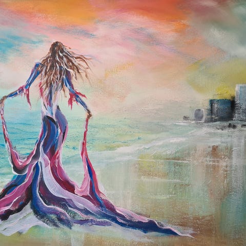 Akrylmaleri malt på lerretsark, som er limt på rammeplaten, uten rammeglass.