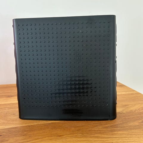 Sort. Har vært brukt og stått på benken med kniver i et års tid.