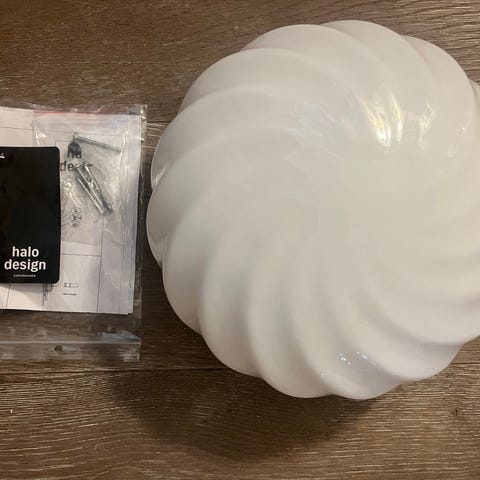 Holmegaard Tivolipendel taklampe designet av Sidse Werner. Lampen er hvit og laget i glass. Den er beregnet for takmontering og har et enkelt, funksjonelt design. Disse ble designet rundt tidlig 1980. 43 cm diameter.