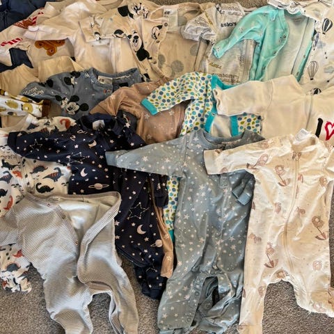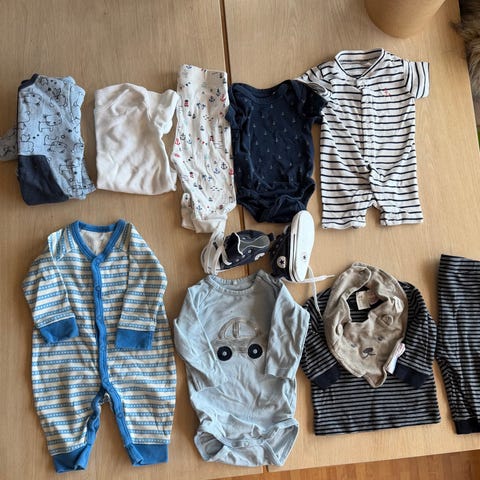 Stor klespakke til gutt med bodyer, pysjer (lang og kortermet), bukser, sparkebukser, tynne luer, sokker, t skjorte bodyer.
