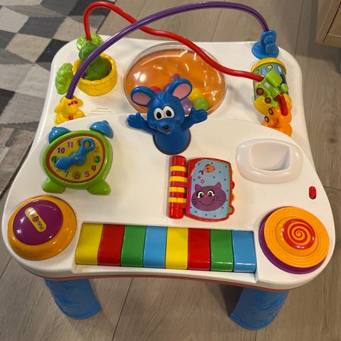 Leketøyet har flere bevegelige deler som barn kan flytte langs buede stenger, inkludert ulike dyrefigurer og fargerike elementer. Hjelper til med å utvikle motoriske ferdigheter og koordinasjon.