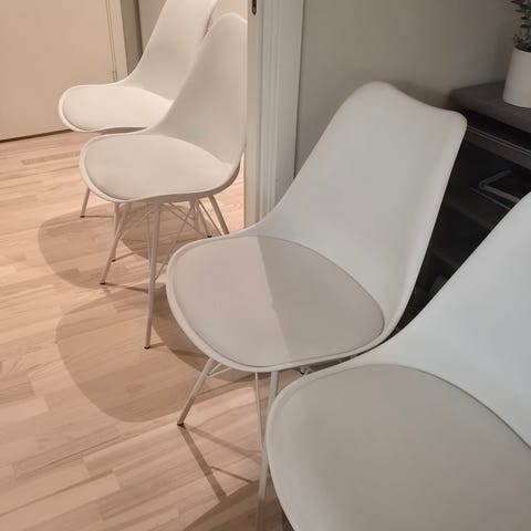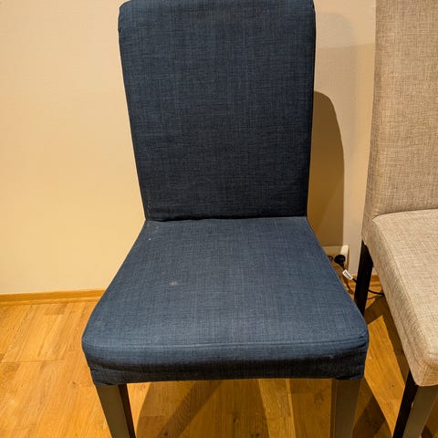 Et sett med 4 spisestoler fra IKEA Bergmund (1195 NOK per stol ny), i grått med svarte ben. De er brukte, men i god stand.