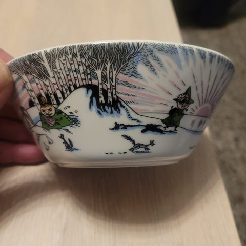Arabia Mummiskål, Tooticky. Skålen er laget av keramikk og har et unikt design med karakteristiske tegninger rundt ytterkanten. Egnet for servering og bruk i kjøkkenet.