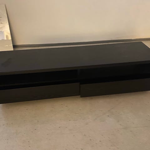 TV-benk fra Trademax selges. Kjøpt i juli 2021. Svart med to skuffer og en skyvedør med to hyller. Noen bruksmerker, legger ved bilder etterhvert.