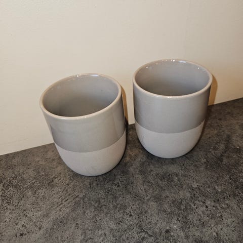 To stk ubrukte krus/kopper fra Magnor selges samlet for 300 kr. Krusene er en del av serviset Lerk som er designet av Halvor Bakke for Magnor.